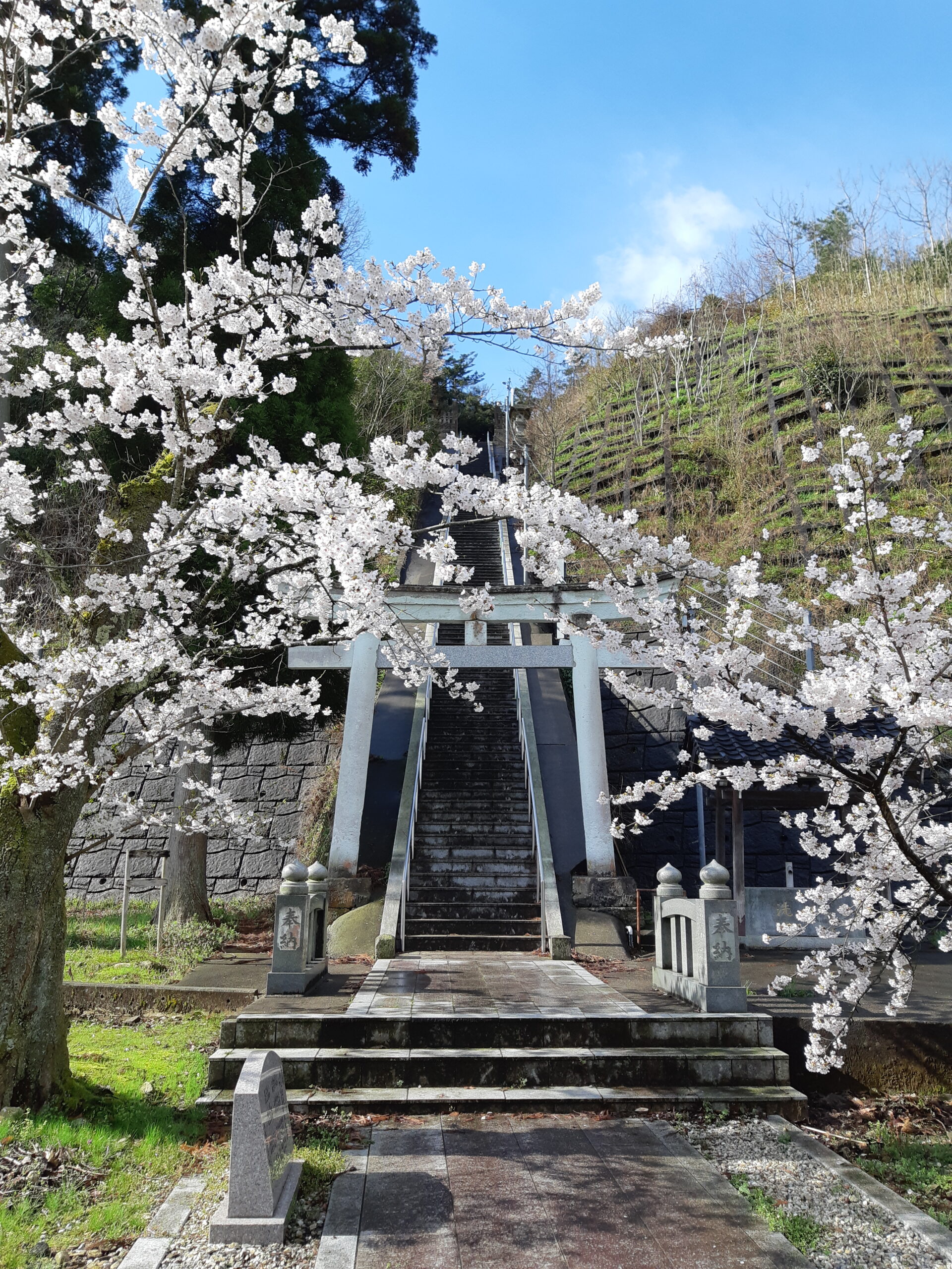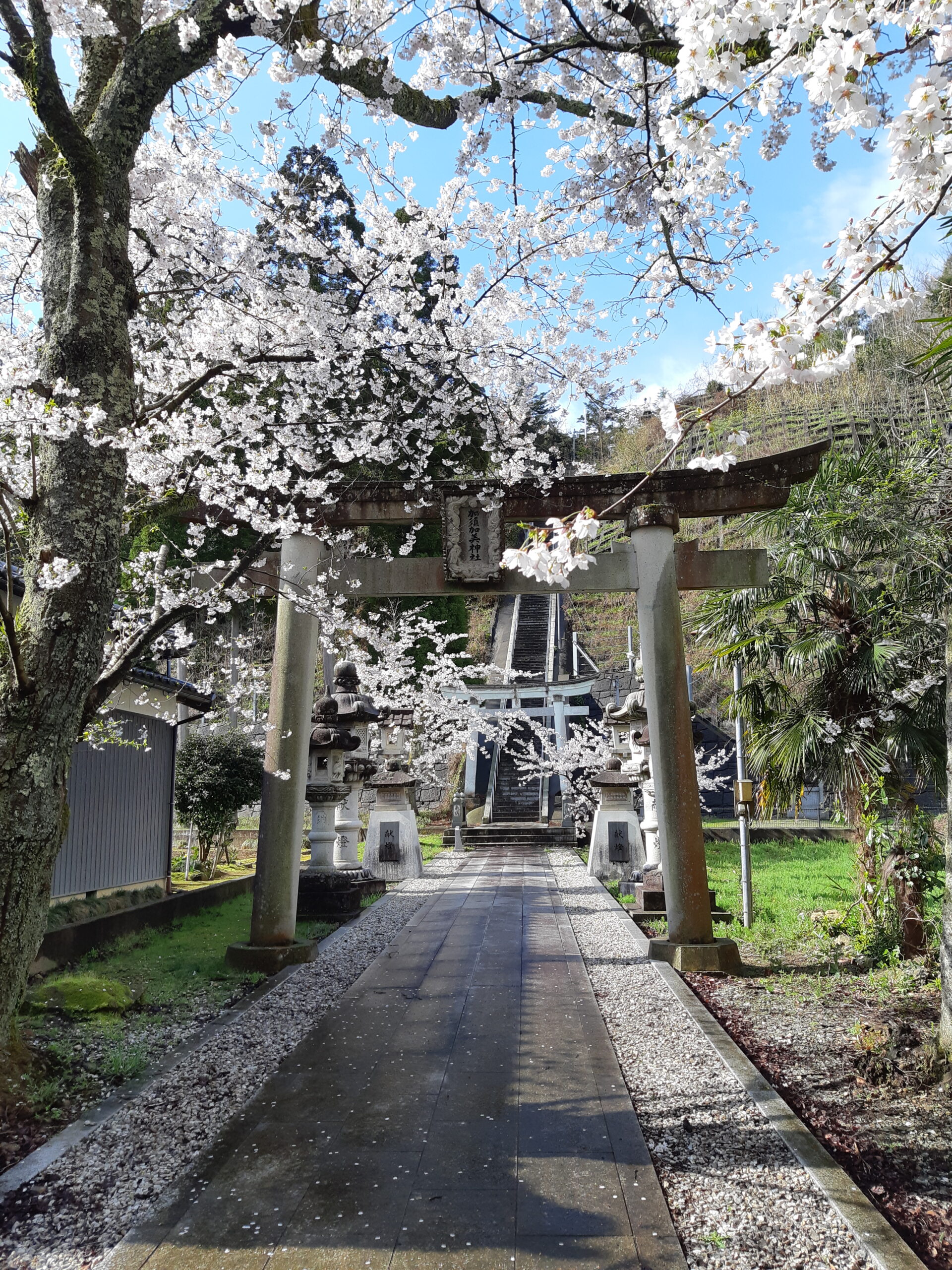 On the other side of the Kakehashi River, tucked behind a quiet cluster of houses, is a pretty little shrine called Kasukami Shrine 加須加美神社. If you happen to come across it in sakura season (we only did because we were lost) you won’t miss its pink shrouded entrance.