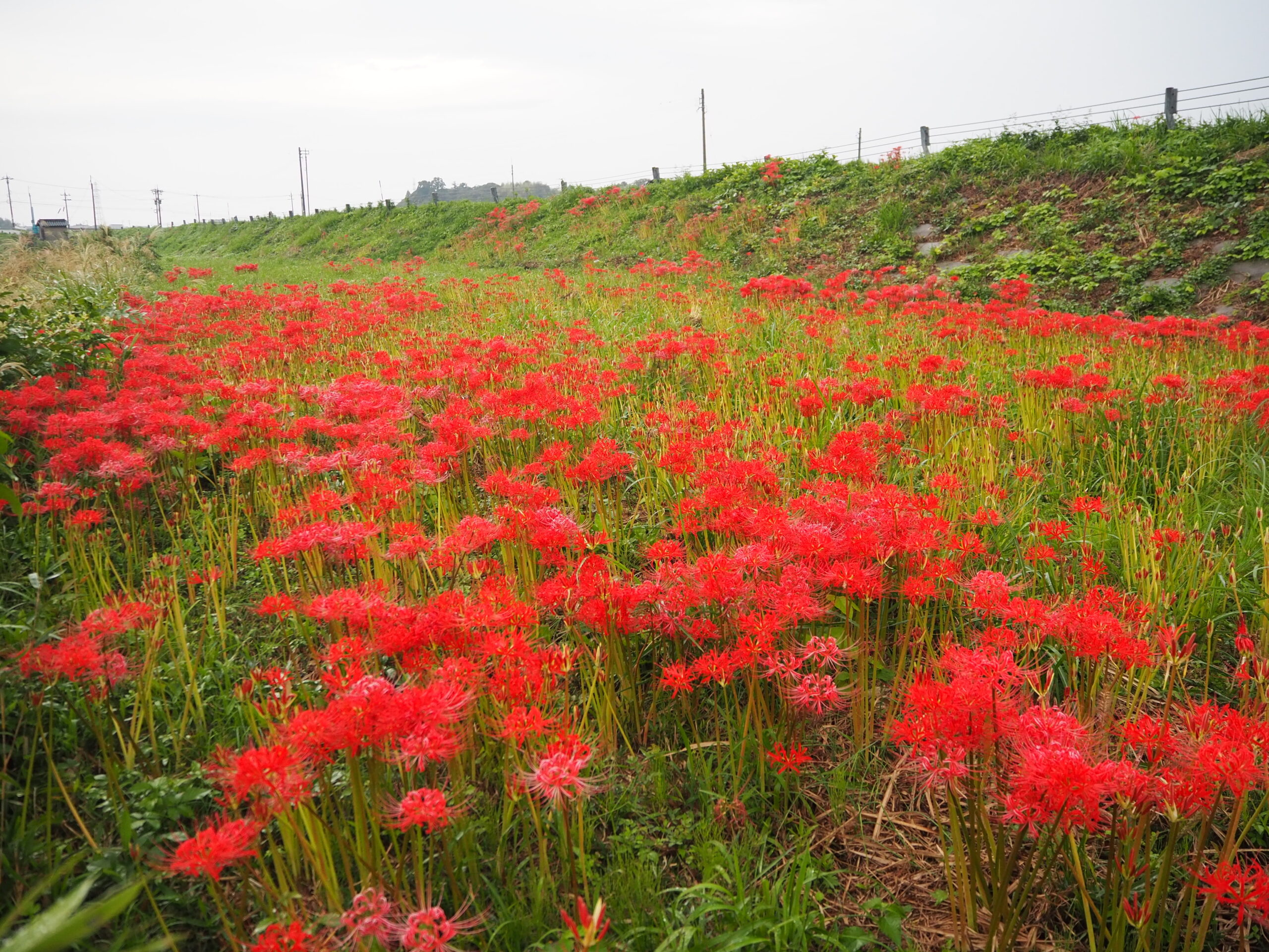 Fiery red spider lilies dotting the banks of the Kakehashi River.