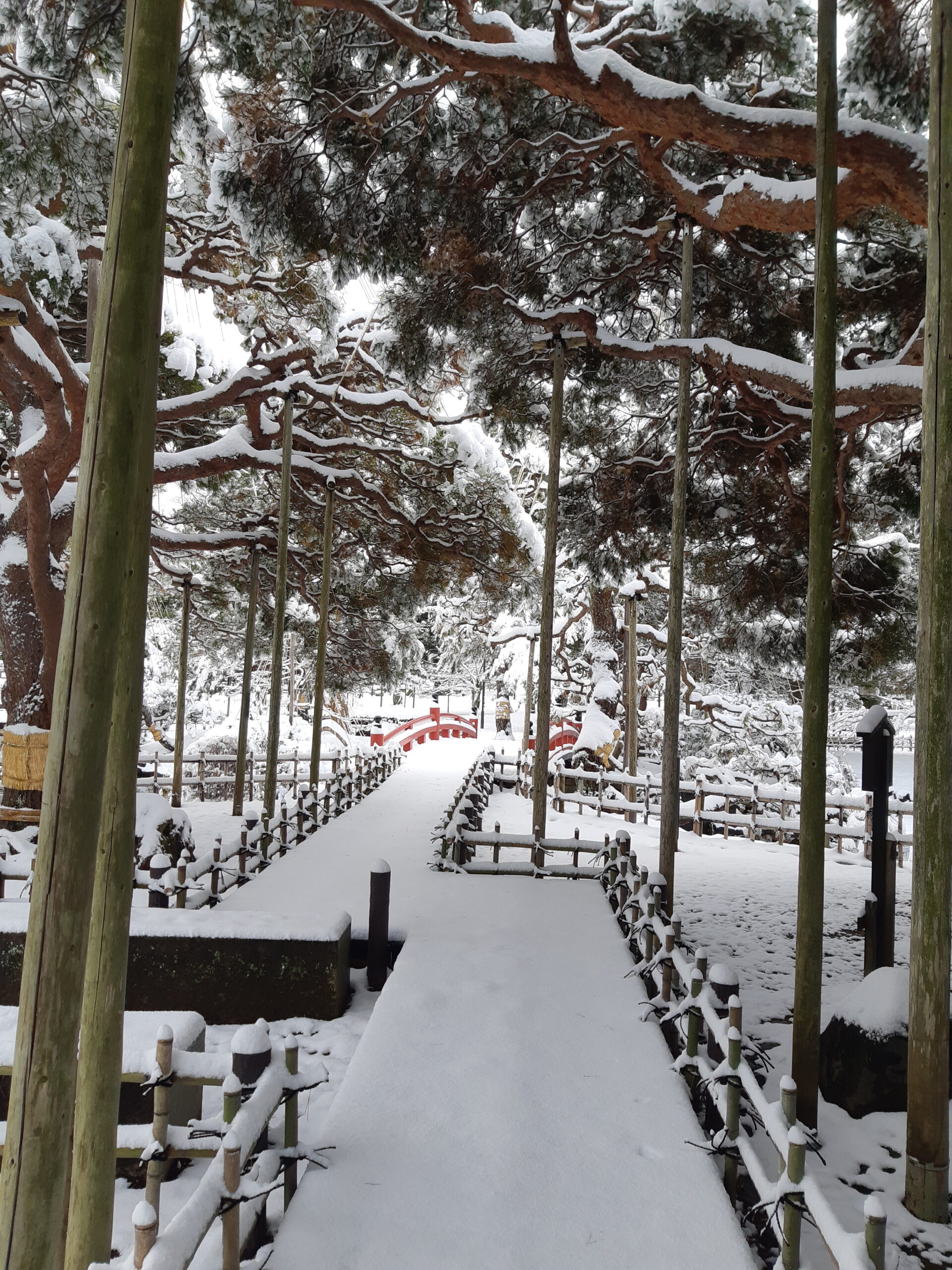 We like to consider it a mini version of Kanazawa’s Kenrokuen Garden, with the traditional garden elements of ponds, mini-hills and waterfalls, and stone bridges and lanterns. And the iconic winter scene of Hokuriku: yukitsuri ropes strung around trees to hold them up in the heavy snow.