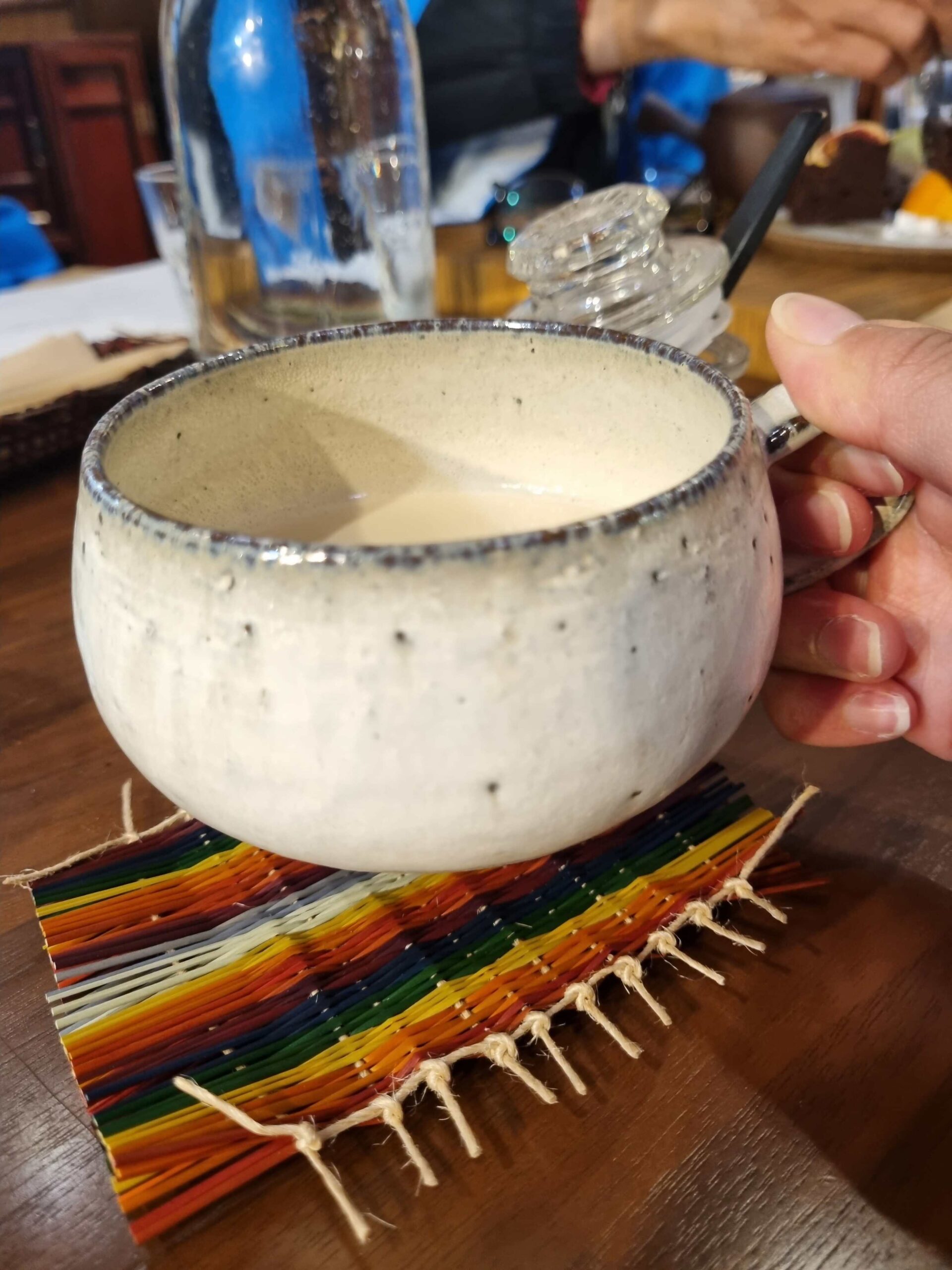 - A mug of Choboya’s Kaga Bocha milk tea, on our handmade coaster!